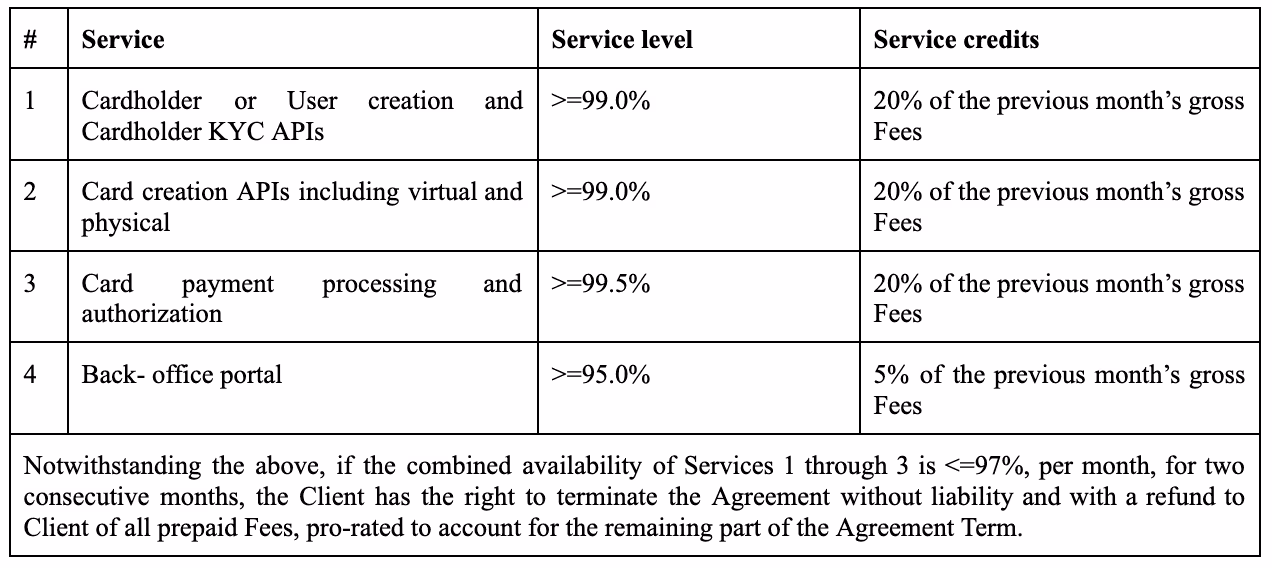 If Client terminates or elects not to renew the Agreement, such that the above Service credit cannot be applied, Kulipa will provide Client an amount in euros equal to the value of the Service credit, capped at one free month of Service Platform Access Fees under that Agreement as its sole remedy in lieu of such Service credit. For clarity, no Service credits shall be due or owing with respect to any period during which Client does not pay Fees due, owing and payable for the applicable Service.