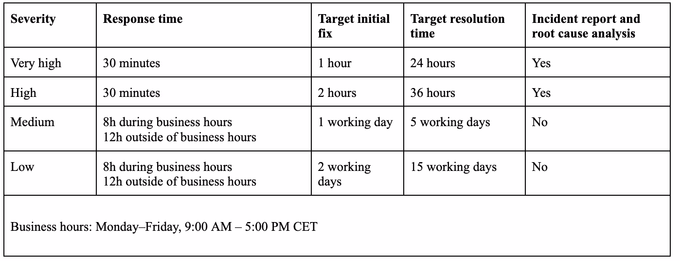Depending on the severity of the incident, Kulipa will handle them according to the following target resolution times. Kulipa will provide an incident report including a root cause analysis as shown in the table below.